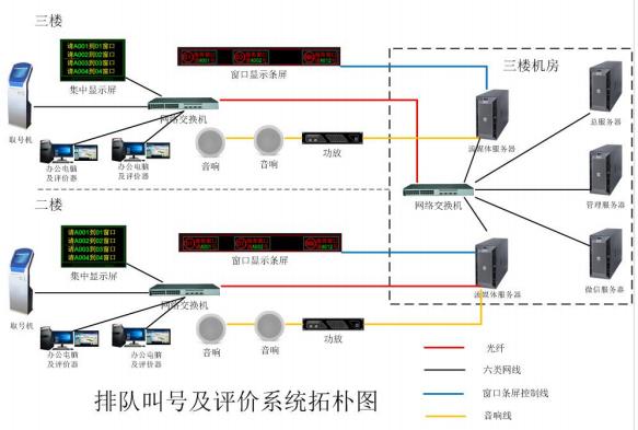 一樓、三樓辦事大廳各設(shè)置為一個叫號區(qū)域配套大屏幕電視機(jī)。一樓、三樓區(qū)域安裝取票機(jī) 1 臺,二 樓區(qū)域安裝取票機(jī) 2 臺。各配套大屏幕電視機(jī)進(jìn)行信息集中顯示,以及音響系統(tǒng)進(jìn)行語音提示。各區(qū)域根