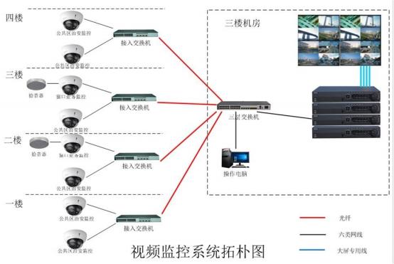 嚴(yán)格遵循綜合布線標(biāo)準(zhǔn),采用六類線、光纖結(jié)合的方式; 所有前端網(wǎng)絡(luò)攝像機(jī)通過六類網(wǎng)線全部連 接到各所屬區(qū)域的接入層交換機(jī),再通過光纖或網(wǎng)絡(luò)線連接到監(jiān)控中心的核心交換機(jī)。