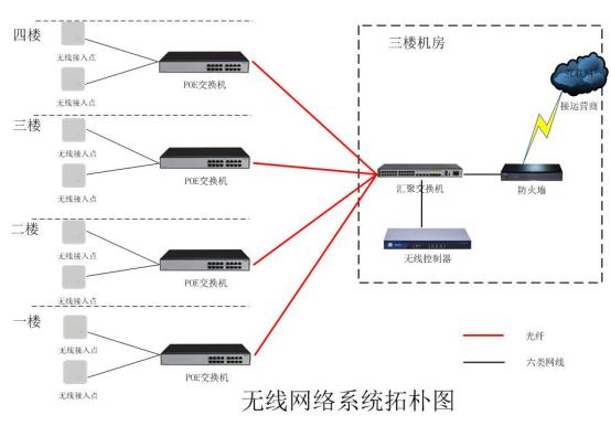 無線網(wǎng)絡(luò)采用無線接入點(diǎn)(AP) +無線控制器(AC) 的企業(yè)級無線網(wǎng)絡(luò)系統(tǒng)架構(gòu),星型拓?fù)浣Y(jié)構(gòu)。在
