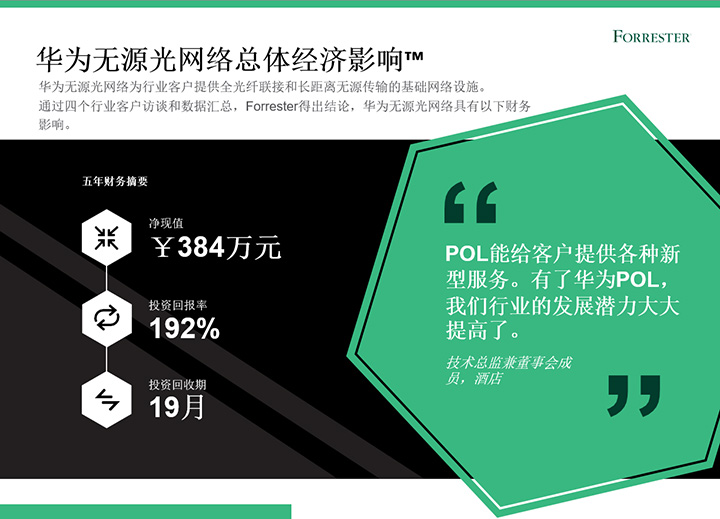 2022年上半年,華為委托權(quán)威咨詢公司Forrester進行了《華為無源光網(wǎng)絡(luò)總體經(jīng)濟影響™》研究。在本研究中,F(xiàn)orrester通過客戶訪談,以專有方法論分析部署華為無源光網(wǎng)絡(luò)(Passive optical LAN,POL)方案對企業(yè)帶來的經(jīng)濟影響。研究結(jié)果顯示,企業(yè)使用華為POL五年投資回報率達192%,投資回報周期為19個月。
