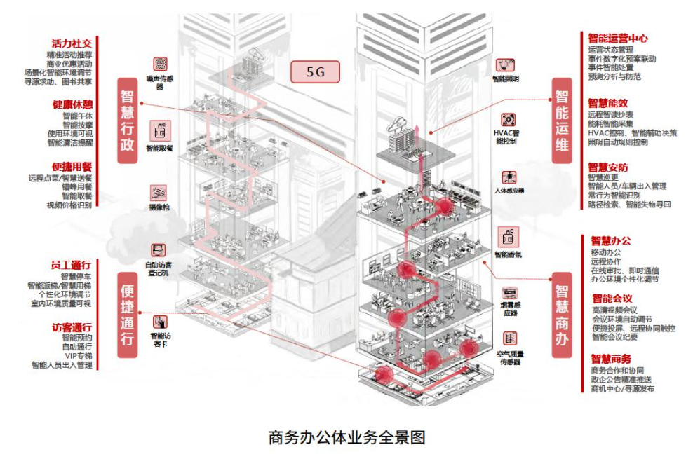 商務(wù)辦公體承載了人們辦公、交流與社交等功能。商務(wù)辦公智慧化發(fā)展的核心,是以用戶體驗為中心,運用數(shù)字化技術(shù)打造智慧化和以人為本的商務(wù)辦公環(huán)境,提高員工工作效率,降低能源損耗,保障辦公安全,由內(nèi)至外提升企業(yè)形象。用數(shù)字化技術(shù)賦能辦公,實現(xiàn)人們"智慧工作"的追求,具有時代意義。下面介紹商務(wù)辦公體藍圖框架及全景圖∶