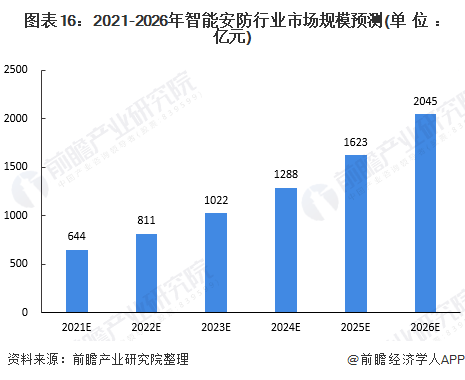 經過多年的高速發展,安防已經發展成為一個龐大的產業。在經歷了數字化、網絡化發展后,安防行業未來將向智能化深度發展,智能安防市場規模也將持續增長,2013-2020年,我國智能安防市場規模的年復合增長率達26%,據此增長率,預計至2026年,市場規模有望達2045億元。